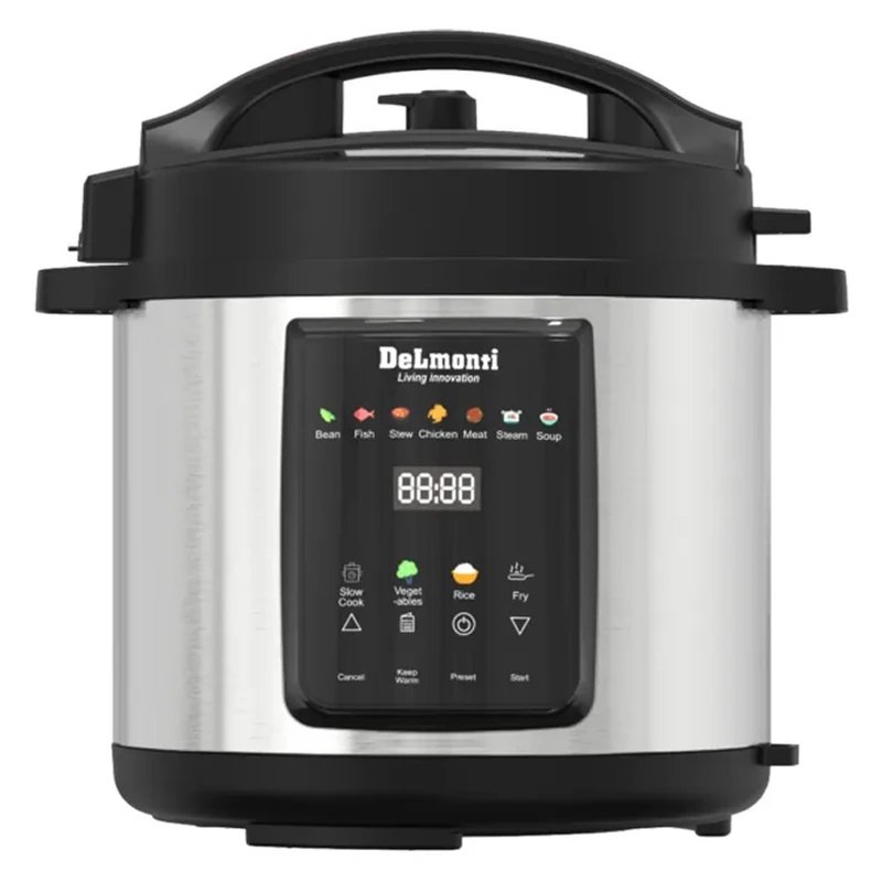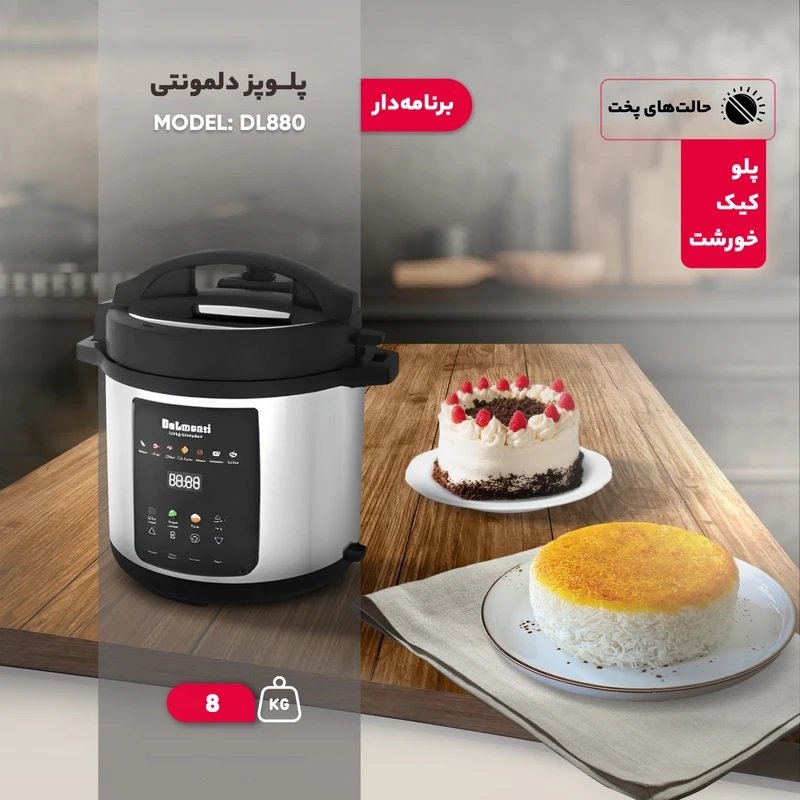 پلوپز ۸ نفره دلمونتی مدل DL880 یکی از محصولات مدرن و پرظرفیت این برند است که برای خانوادههای پرجمعیت یا علاقهمندان به مهمانیهای خانوادگی طراحی شده است. این دستگاه با ظرفیت ۸ لیتر، توان مصرفی ۱۲۰۰ وات و قابلیت پخت برای ۸ نفر، بهراحتی میتواند نیاز یک خانواده بزرگ را در پخت غذاهای متنوع برطرف کند. ترکیب بدنه از استیل ضدزنگ و پلاستیک باعث شده ظاهر دستگاه هم زیبا و مدرن باشد و هم مقاومت مناسبی در برابر ضربه و حرارت داشته باشد. دیگ داخلی آن از جنس سرامیک ساخته شده که نسبت به تفلون دوام بیشتری دارد، خطوخش کمتری میگیرد و از نظر سلامتی هم گزینهای مطمئنتر بهحساب میآید. از نظر کارایی، این مدل فراتر از یک پلوپز ساده عمل میکند. کاربر میتواند علاوه بر پخت برنج، غذاهایی مانند کیک و خورشت را هم در آن آماده کند. وجود بیش از ۷ برنامه پخت پیشفرض این امکان را فراهم کرده که تنها با انتخاب حالت مورد نظر، دستگاه باقی کار را انجام دهد. سیستم گرمایش المنت پایین گرما را بهصورت یکنواخت منتقل میکند و نتیجه نهایی غذایی خوشطعم و کامل خواهد بود. کنترل پنل لمسی به همراه نمایشگر و آیکونهای تصویری، کار با دستگاه را ساده و لذتبخش میکند. کاربر میتواند نوع برنامه، زمان باقیمانده و تنظیمات مختلف را بهوضوح روی صفحه مشاهده کند. همچنین سیستم خاموشی خودکار بهعنوان یک ویژگی ایمنی مهم تعبیه شده تا در صورت اتمام زمان یا نبود آب کافی، دستگاه بهطور خودکار متوقف شود. پلوپز دلمونتی DL880 با ابعاد ۴۲x۳۶x۳۶ سانتیمتر و وزن ۸ کیلوگرم نسبتاً بزرگ است و نیاز به فضای کافی در آشپزخانه دارد. این دستگاه بیشتر مناسب خانوادههای پرجمعیت و افرادی است که به دنبال یک وسیله چندمنظوره برای پخت غذاهای مختلف هستند و میخواهند ترکیبی از ظرفیت بالا، دوام مناسب و طراحی مدرن را در اختیار داشته باشند.